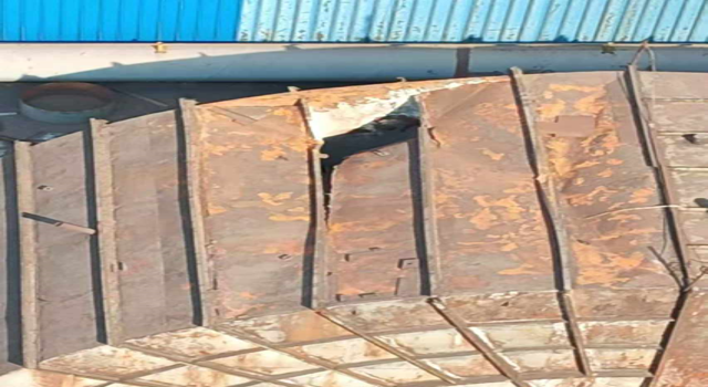 8月27日,檢修員在巡檢時發(fā)現(xiàn)并上報了燒結(jié)二號脫硫增壓風(fēng)機進口煙道頂部約27㎥鋼板出現(xiàn)塌陷,威遠(yuǎn)藍(lán)鼎生產(chǎn)部高度重視,立即將風(fēng)險隱患上報燒結(jié)廠部領(lǐng)導(dǎo),協(xié)商時間處理。當(dāng)天廠部協(xié)商停機4小時對脫落部位進行臨時加固處理。8月28日,廠部利用高溫限電停機11小時,對二號燒結(jié)進口煙道頂部脫落位置進行全面檢修。